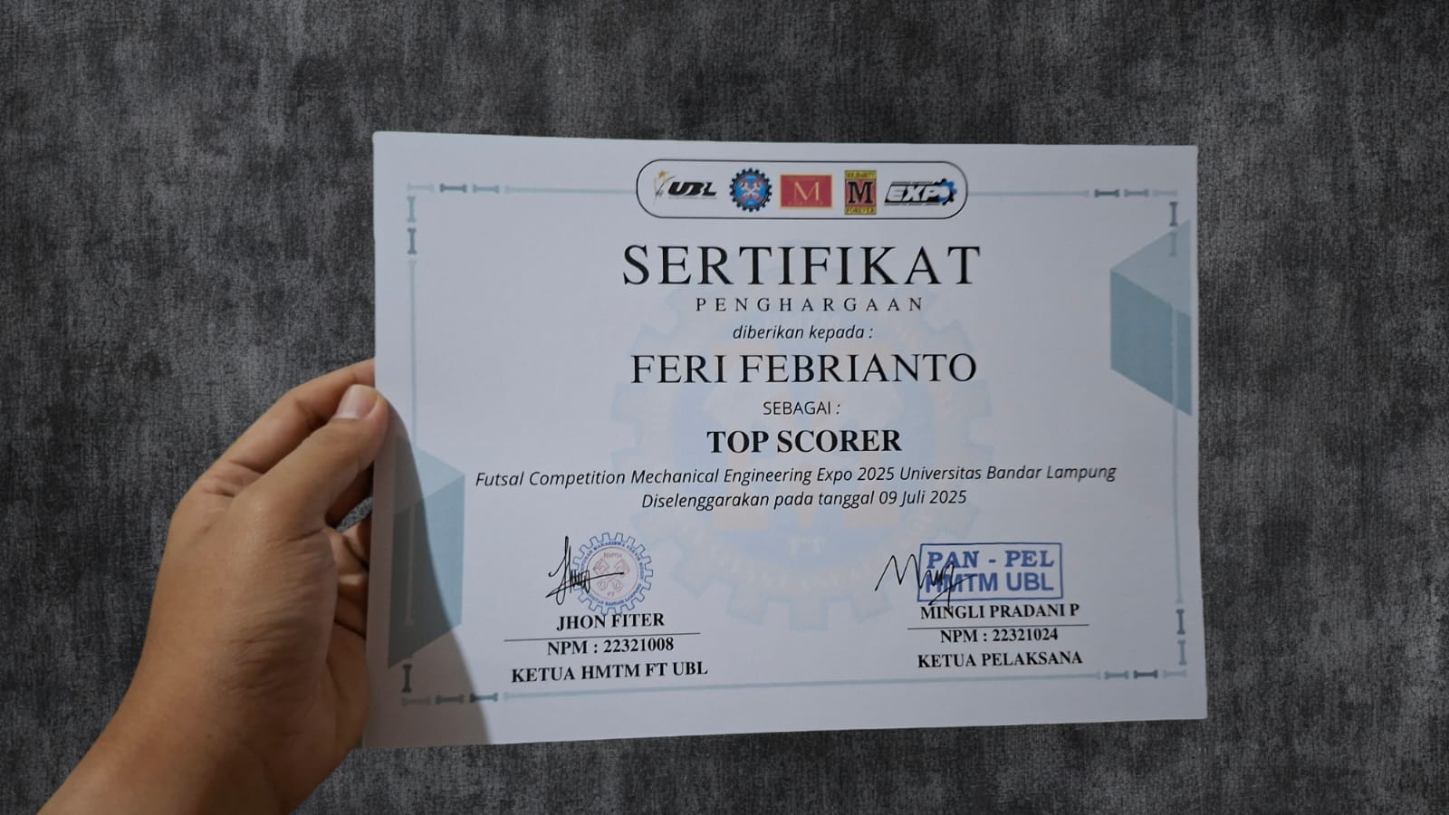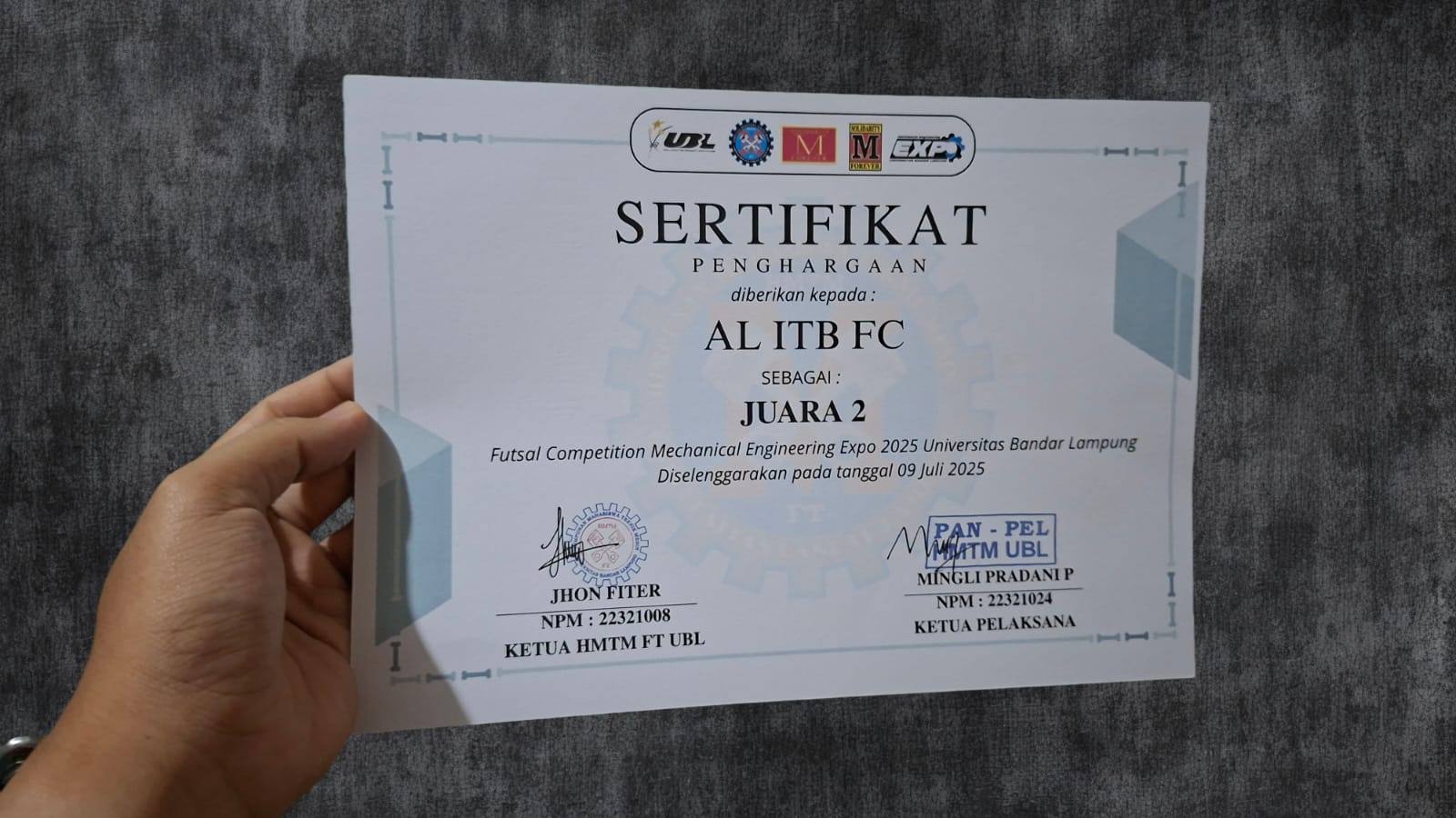Pada gelaran Mechanical Engineering Expo Futsal Competition 2025 yang diadakan oleh Universitas Bandar Lampung. Team Futsal AL ITB mendapat Juara 2 setelah gagal menang di babak Final.